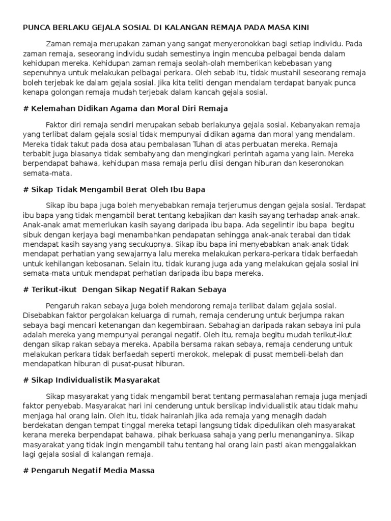 Punca Gejala Sosial Dalam Kalangan Remaja. Anda digalakkan menggunakan perkataan anda sendiri tanpa mengubah maksud. Dasawarsa ini sama ada kita sedar atau tidak lantaran terlalu dihidangkan dengan pembangunan negara yang semakin gah di persada dunia kepincangan sosial yang berlaku dalam kalangan masyarakat Malaysia adalah semakin ketara.