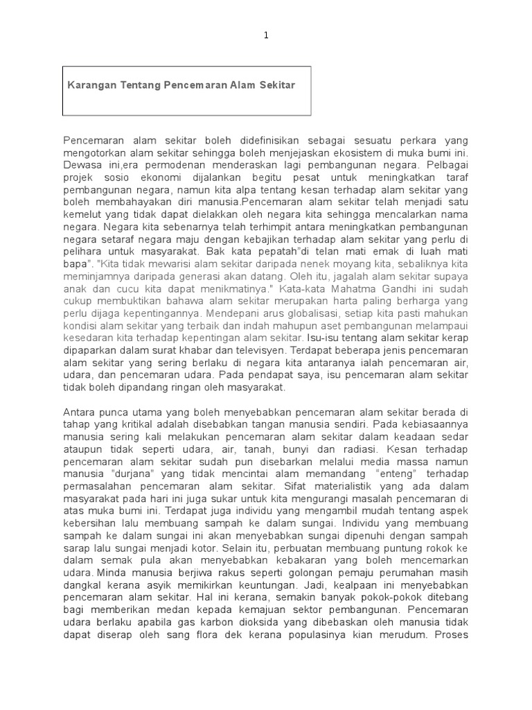 Tidak hairanlah di mana-mana sahaja kita dapat melihat pencemaran alam sekitar berlaku terutamanya pencemaran sungai yang berada pada tahap kritikal di negara kita. Pencemaran pada hari ini semakin berterusan dari semasa ke semasa. Contoh karangan tingkatan 1 soalan.