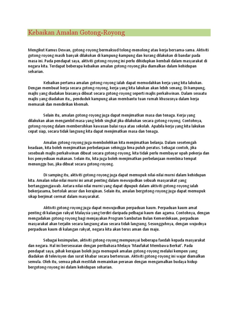 Semua penduduk taman perumahan wajar bekerjasama untuk melakukan kerja itu bak kata pepatah yang berat sama idpikul yang. Sehubungan dengan itu kerajaan telah melaksanakan beberapa inisiatif untuk menarik perhatian dan minat masyarakat terhadap amalan bergotong-royong. Kita tidak dapat menafikan bahawa banyak kebaikan yang diperoleh oleh masyarakat daripada amalan bergotong-royong.